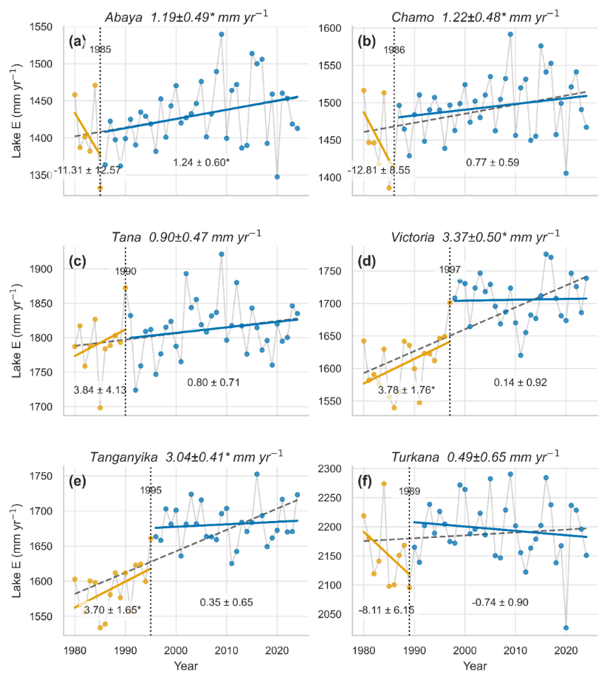1980年至2024年东非六个湖泊年蒸发量(湖泊蒸发,Lake E)的长期变化趋势