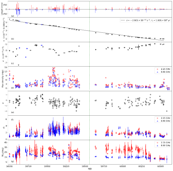 XTE J1810−197自转和辐射参数随时间演化:(a)双频观测时长;(b)自转频率;(c)自转频率一阶导数;(d)双频流量密度;(e)谱指数;(f)中间成分的相位调制指数;(g)中间成分在峰值强度10%处宽度。