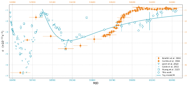 XTE J1810−197在其2003年(橙色)和2018年(蓝色)射电活跃期自转频率一阶导数演化的对比,其中蓝色实线为使用扭曲磁层模型对2018年射电活跃期数据的拟合结果。