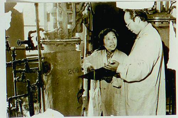 20世纪60年代,微生物所严自正(左)和陶增鑫在工厂做维生素C绿色发酵实验。微生物所供图