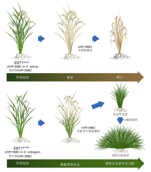 MIR156BC的重置介导了水稻从一年生向营养生长型多年生的转变。栽培水稻具有有限的生命周期,从开花结种到衰老,MIR156BC未被重新激活。在携带野生稻MIR156BC等位基因的栽培水稻中,MIR156BC在种子成熟后的节间分蘖芽中被重新激活,从而支持持续生长,并表现出类似禾草的性状,包括花序逆转和营养繁殖能力。进一步聚合匍匐生长基因后,植株转变为类似野生的形态,支持营养多年生生长。
